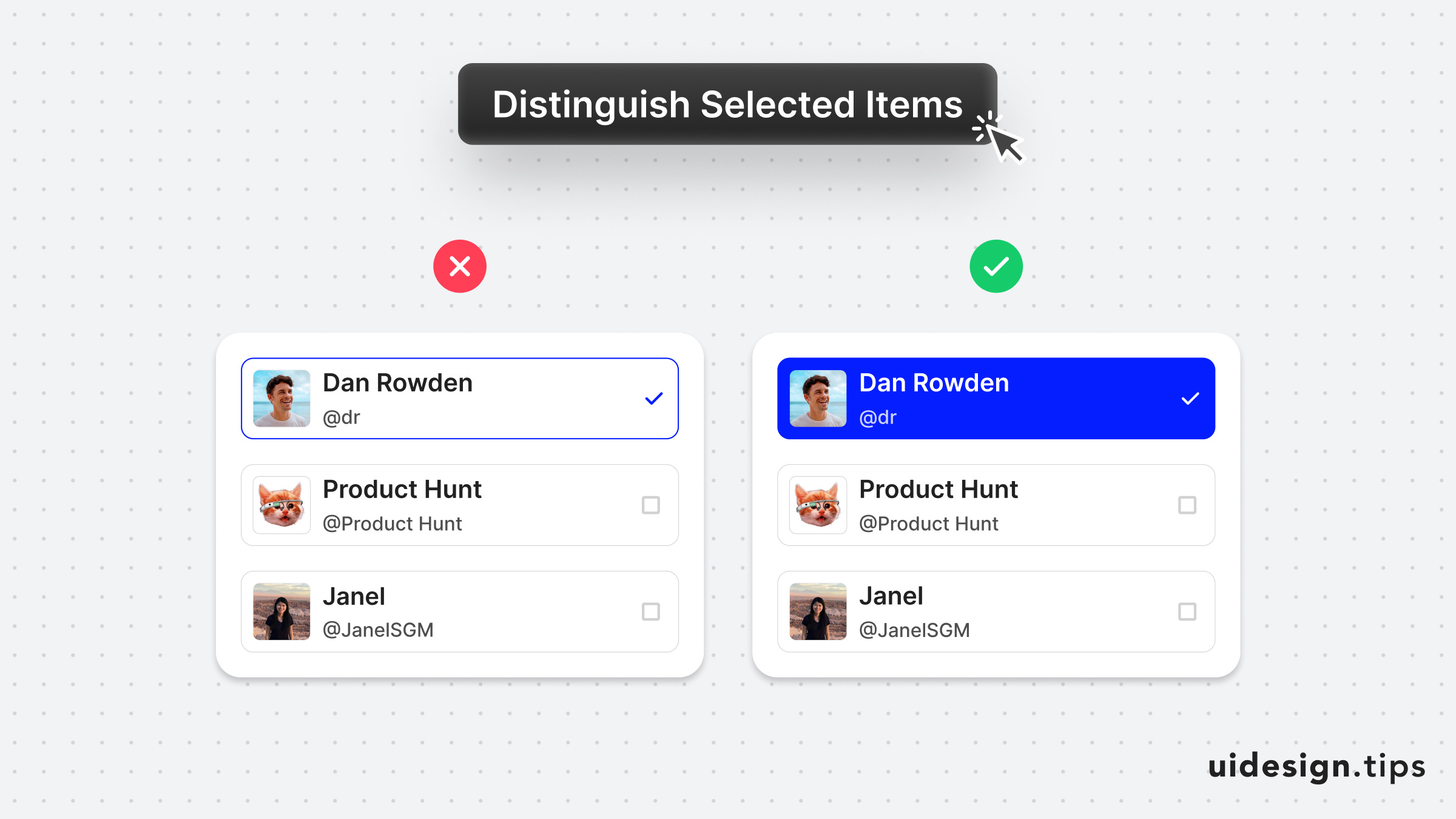 Always make sure that your selected items are easily identified at a glance.